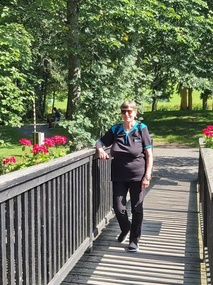![]() Fyrenin seisova pöytä. Kuva Eila. | ![]() Seisovassa pöydässä färssiä ja kuhaa, kuva Eila. | ![]() Ritva Fiskarsissa. Kuva Ulla. |