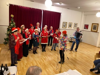 ![]() Kuoro Monisointuiset esitti joululauluja Eira johti ja Arto soitti haitaria. | ![]() Kuoro Monisointuiset esiintyy |