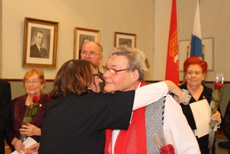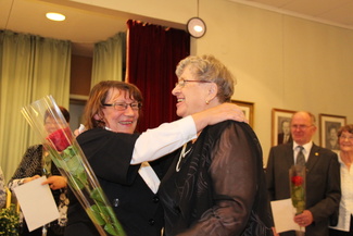 ![]() Kuoronjohtaja Inkeri Tuunela saa ruusun sihteeri Marja Holopaiselta. |