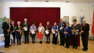 ![]() Kunniamerkkien saajat Kultainen ansiomerkki Mauri Kuutti ja Satu Taskinen, hopeinen ansiomerkki Päivi Sulander, Ulla Kuoppala, Reijo Isoaho ja Annette Nieminen. Ruusut Sointu Kuutti, Anneli Mellin, Jorma Sulander, Eila Häkkinen ja Marja Holopainen. | ![]() Koko kööri koossa ruusuineen ja merkkeineen. |