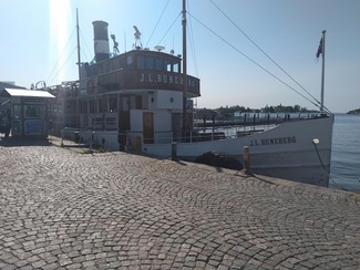 ![]() M/s J.L. Runeberg jolla risteilimme Porvooseen. | ![]() Odottelua laivaranassa Helsingissä istumassa Ritva, seisomassa Hilkka, Eira, Kyösti, Reijo I., | ![]() Syötiin Runebergin-torttua ja juotiin kahvit/teet laivalla. |