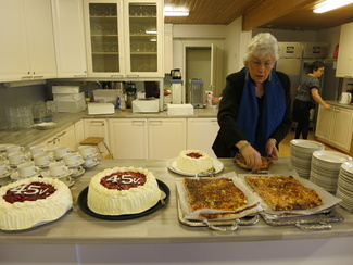 ![]() Tuusulan eläkkeensaajien Emäntä Sointu Kuutti ja apulaisena toiminut Pirjo Laamanen tarjoamisten kera. Maukasta mansikkakakkua ja suolaisia piirakoita. |
