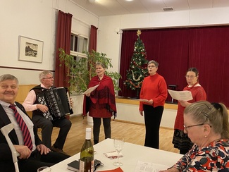 ![]() Kuoro Monisointuiset aloitti pikkujoulut laulullaan johtajana Taina Piira ja säestäjänä Arto Heiskanen | ![]() Joululaulut raikaa |