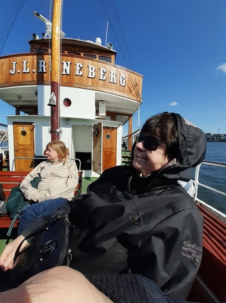 ![]() M/s J.L. Runeberg jolla risteilimme Porvooseen. | ![]() Odottelua laivaranassa Helsingissä istumassa Ritva, seisomassa Hilkka, Eira, Kyösti, Reijo I., | ![]() Syötiin Runebergin-torttua ja juotiin kahvit/teet laivalla. |