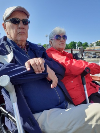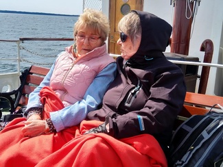 ![]() Merimetsojen ulosteiden autioittamia luotoja Suomenlahdella. | ![]() Kyllä on mukavaa matkustella kauniissa kesäsäässä tuumaa Eila. | ![]() Sointu ja Mauri kesätunnelmissä laivalla. |