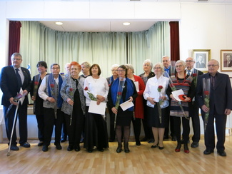 ![]() Juhlassa mitalien ja ruusun saajat yhteiskuvassa |