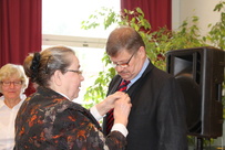 ![]() Puheenjohtaja Jorma Sulander pitää juhlapuheen. | ![]() Hilja Mattinen saa hopeisen ansiomerkin Arja Ojalalta. |