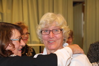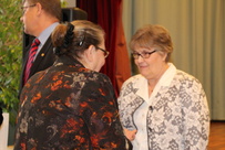 ![]() Kerttu Wasankari saa hopeisen ansiomerkin Arja Ojalalta. | ![]() Juhlayleisöä. |