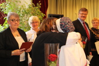![]() Kuoronjohtaja Inkeri Tuunela saa ruusun Marjalta. |