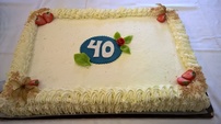 ![]() 40-vuotisjuhlakakku. | ![]() Puheenjohtaja Jorma Sulander saa hopeisen ansiomerkin Arja Ojalalta EKL:stä. |