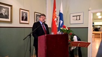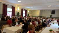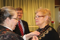 ![]() Kerttu Wasankari saa hopeisen ansiomerkin Arja Ojalalta. | ![]() Juhlayleisöä. |